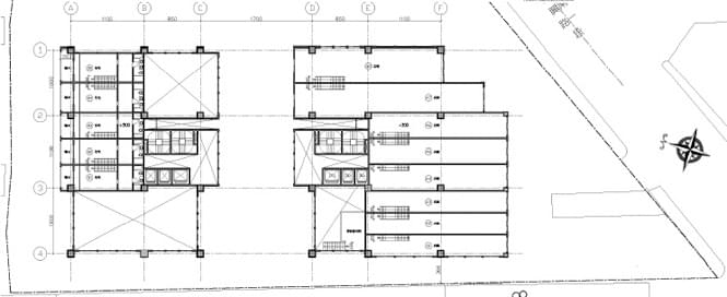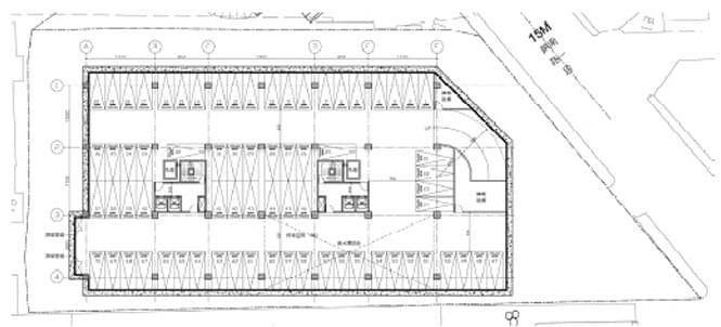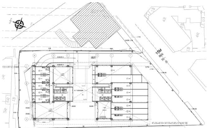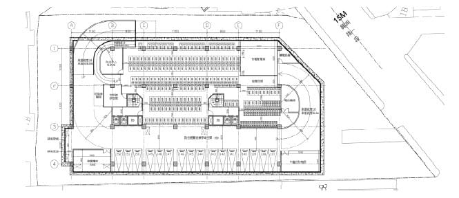 2. 規劃戶數及空間用途:地下層為防空避難室兼停車空間與停車空間。地面一、二層配置一般零售業、住宅入口門廳與單元套房。地面三層以上設置住宅單元,共145戶。一層平面圖