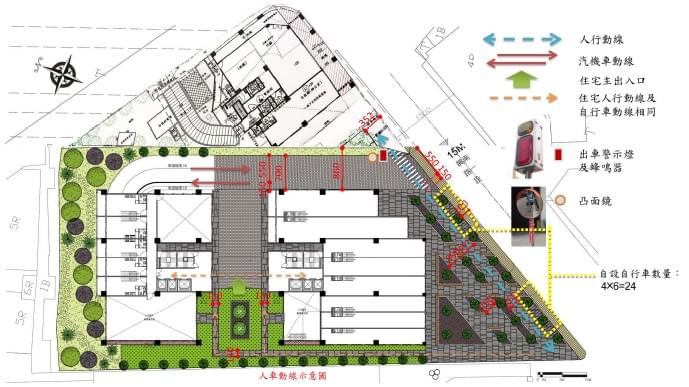 2. 基地汽機車之停車空間出入口位於興南路一段,汽機車進出停車空間之動線規劃說明如下:主要係透過興南路一段主要道路轉進基地內私設通路進入本基地。人車動線示意圖