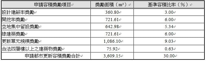 1. 申請容積獎勵額度:申請都市更新容積獎勵總計3,609.15㎡,約占基準容積比率之30.00%。