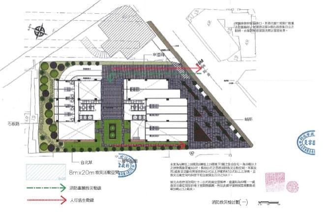 3. 緊急危難時可藉由建築物內部的垂直逃生動線通往東側社區主要出入口或西側逃生出口連接戶外逃生動線。消防救災檢討圖