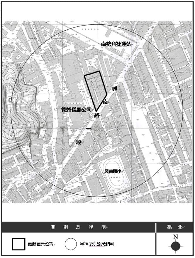 本計畫更新單元南側臨接興南路一段,西側臨接德州儀器公司(工業區),東側距離南勢角捷運站約80公尺。本計畫更新單元非位於更新地區內,為自行劃定之更新單元。在此處新增文本段落。(二)更新單元範圍